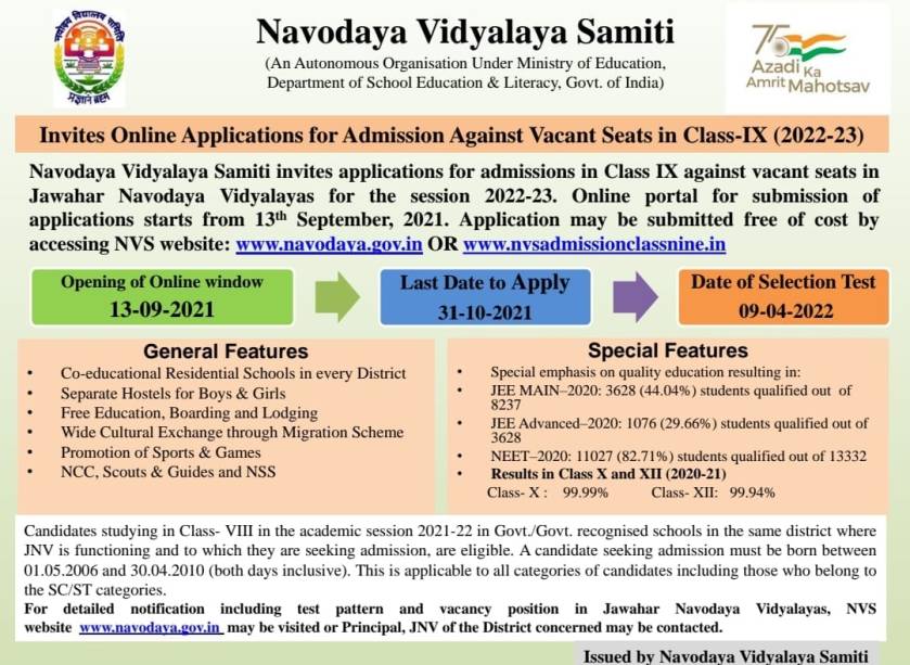 NAVODAYA VIDYALAYAS FOR ADMISSION IN CLASS IX DURING 2022-23 AGAINST