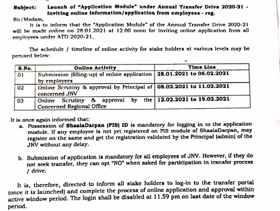 Annual Transfer Drive 2021 JNV , NVS Shedule of Annual Transfer Drive 2021 for Staff of Jawahar Navodaya Vidyalaya, India mail me Email a link to a friend (Opens in new window) Email Like Loading...