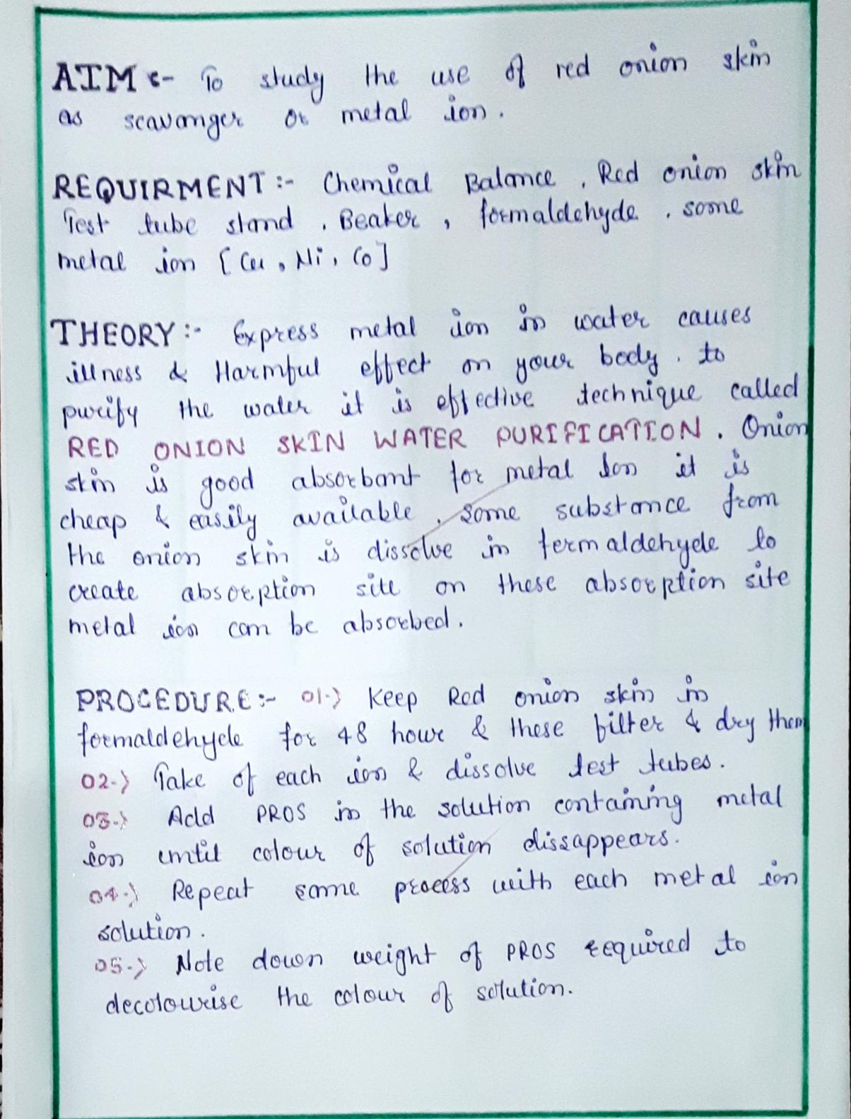 Investigatory Project-01-Use of red onion skin as scavenger of metal ion. अन्वेषक परियोजना-01-धातु आयन के सफ़ाई कर्ता के रूप में लाल प्याज के छिलके का उपयोग।